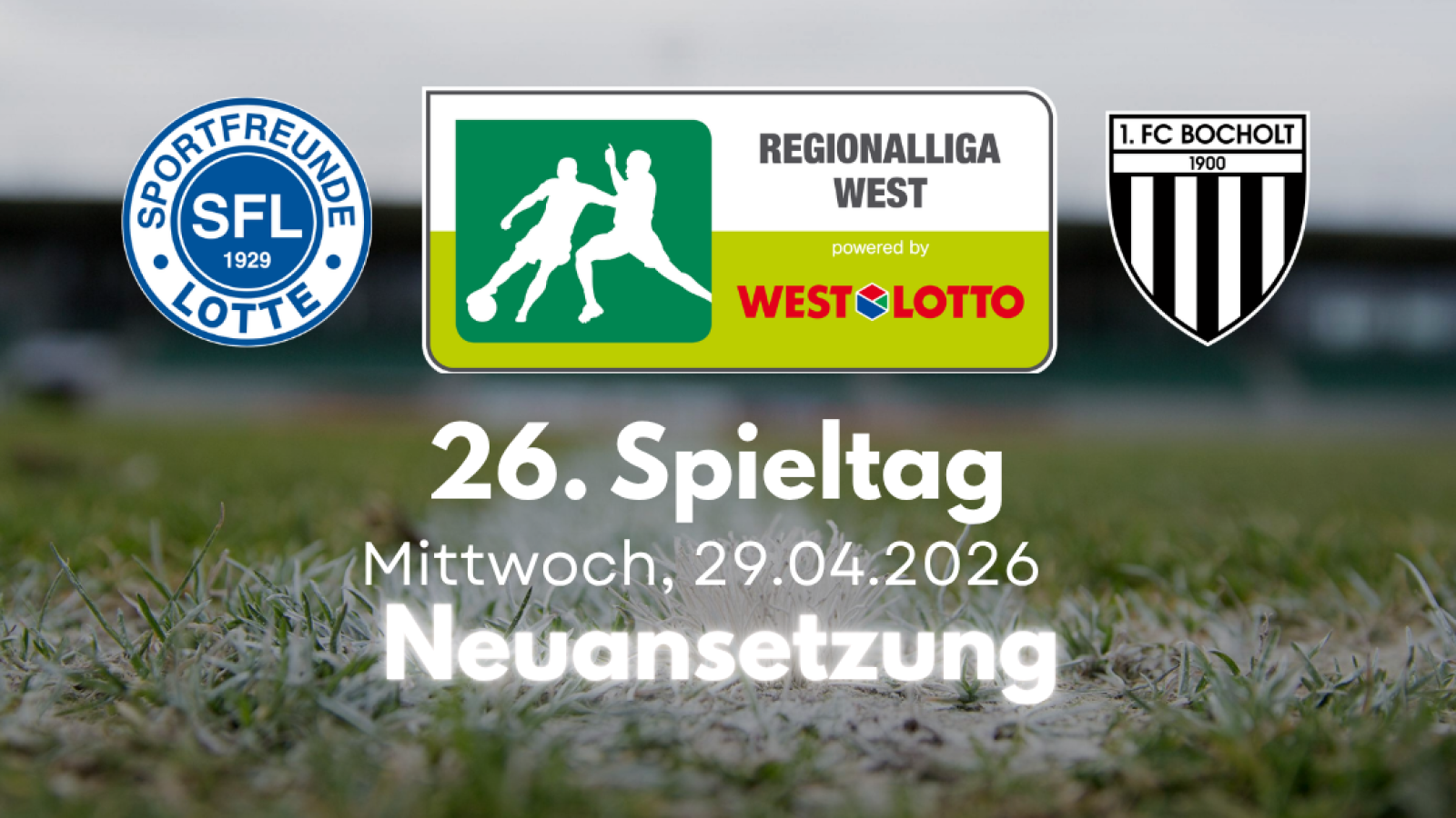 Der Spielleiter der Herren-Regionalliga West hat das Spiel VfL Sportfreunde Lotte gegen 1.FC Bocholt neu angesetzt. Der 26. Spieltag wird am 29.04.2026 um 19:30 nachgeholt.